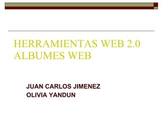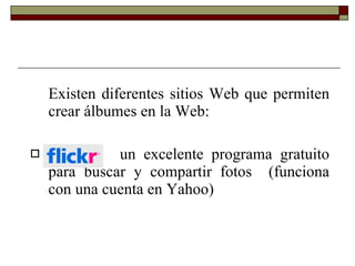 El documento describe diversas herramientas web 2.0 para crear álbumes de fotos, destacando Flickr y Picasa como opciones destacadas. Flickr permite buscar y compartir fotos fácilmente, mientras que Picasa ofrece funciones para organizar, editar y compartir fotografías. Se incluye una guía sencilla para crear un álbum en Picasa.