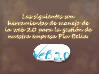 El documento describe 8 herramientas web de Google que pueden ser útiles para la gestión de la empresa Piu Bella, incluyendo Google Sites para crear un sitio web, Google Alerts para monitorear la marca, Google Analytics para medir estadísticas del sitio, Gmail para comunicarse con clientes, y Google Drive para almacenar archivos en la nube.