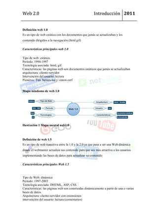 El documento define las características de la Web 1.0, Web 1.5 y Web 2.0, incluyendo sus períodos, tecnologías asociadas y niveles de participación del usuario. Explica que la Web 2.0 se centra en la colaboración donde el usuario es el foco, y características como Ajax, XML y APIs permiten a los usuarios publicar información y realizar cambios. También describe herramientas como RSS que permiten a los usuarios suscribirse a contenido de sitios web para mantenerse actualizados.