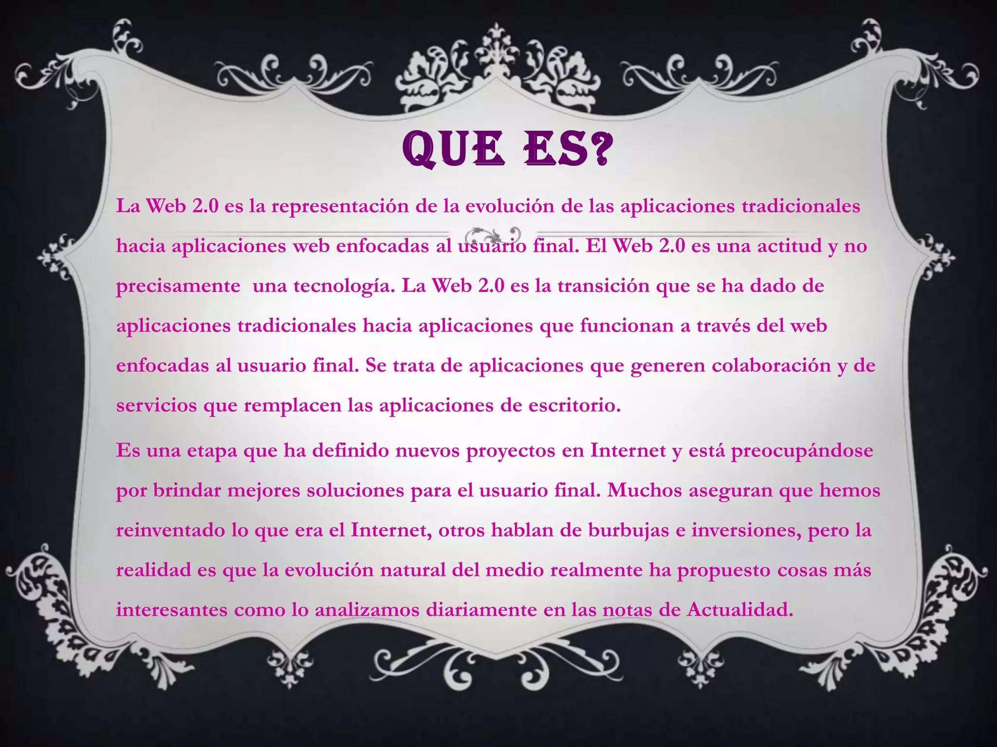 El documento describe la Web 2.0 como la evolución de las aplicaciones tradicionales hacia aplicaciones web enfocadas al usuario final que fomentan la colaboración. Se define la Web 2.0 como una actitud más que una tecnología, y se explica su historia y características principales como la interactividad, participación de los usuarios y contenido generado por los usuarios. Finalmente, se discute el potencial de la Web 2.0 para mejorar la educación al facilitar experiencias de aprendizaje más ricas.