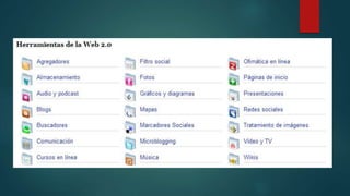 Este documento describe las herramientas de la Web 2.0 y 3.0. Explica que las herramientas Web 2.0 permiten a los usuarios crear y compartir contenido en lugar de solo consumirlo. Luego describe algunas características clave de la Web 2.0 como blogs, redes sociales y contenido generado por usuarios. Finalmente, explica que la Web 3.0 usa bases de datos para permitir un acceso más inteligente a la información a través de aplicaciones que facilitan la comunicación entre personas y sistemas.