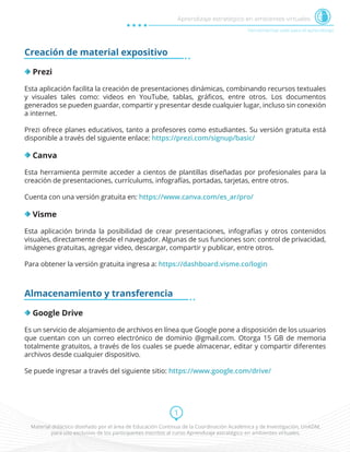 Este documento describe varias herramientas web gratuitas para la creación de material didáctico, almacenamiento y transferencia de archivos, videoconferencias, edición de video, bancos de imágenes, conversión de formatos, compresión de archivos, blogs y representación gráfica de conceptos. Entre ellas se encuentran Prezi, Canva y Visme para creación de presentaciones; Google Drive y Dropbox para almacenamiento; Hangouts, Skype y Zoom para videoconferencias; e Icecream Video Editor y Powtoon para edición de video.