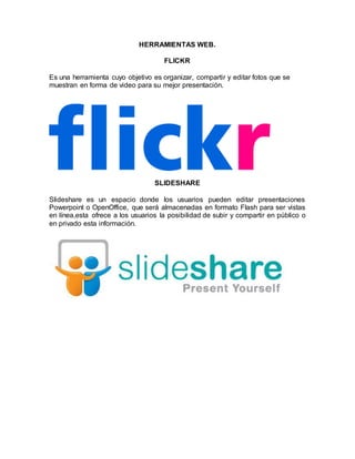 Este documento describe diferentes herramientas web como Flickr, Slideshare, Animoto, Prezi, Mindomo, Powtoon, Pixton, Google Drive, One Drive, Dropbox y Camtasia. Cada una tiene un propósito específico como organizar y compartir fotos, crear presentaciones, hacer videos, mapas conceptuales, cómics y capturar la pantalla. Todas ellas permiten editar, compartir y presentar contenidos de forma creativa y efectiva.