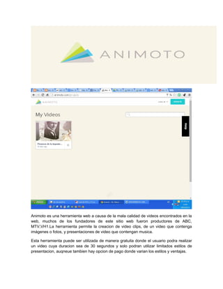 Slideshare es un sitio web que permite publicar presentaciones de diapositivas de forma pública o privada de manera gratuita. Animoto es una herramienta para crear videos a partir de imágenes, presentaciones o música de forma gratuita o paga con más estilos. Prezi permite crear presentaciones dinámicas con zoom, sonido, videos y figuras de manera interactiva. Mindomo es una herramienta para crear mapas mentales o conceptuales agregando contenido de forma gratuita.