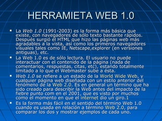 La Web 1.0 (1991-2003) permitía solo lectura de páginas web de texto. La Web 2.0 (2004-presente) facilita el compartir información y la colaboración entre usuarios a través de redes sociales, wikis y blogs. La Web 3.0 se refiere a la evolución futura hacia el uso de inteligencia artificial y la web semántica para crear contenido accesible en múltiples aplicaciones más allá de los navegadores.
