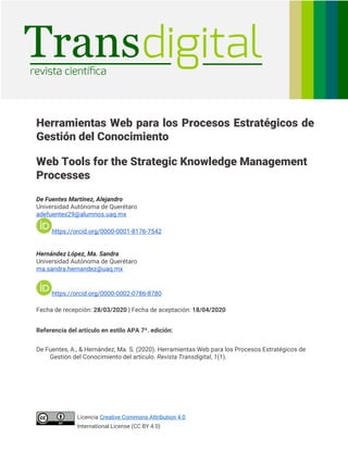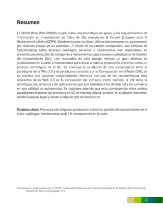Este documento presenta una selección de herramientas web para procesos estratégicos de gestión del conocimiento. Explica que la World Wide Web surgió para apoyar la investigación científica y ha evolucionado a través de diferentes etapas, convergiendo la Web 2.0 y la computación en la nube para permitir la producción colectiva de conocimiento de forma ubicua. A través de un estudio comparativo, se identifican categorías y herramientas que aprovechan la inteligencia colectiva para gestionar el conocimiento en la n