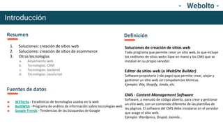 Este documento resume las herramientas y tecnologías web más utilizadas en marzo de 2020. WordPress tiene más de la mitad del mercado de creación de sitios web, seguido de Wix y Progress Sitefinity. En España, WordPress también es líder pero le sigue más de cerca Plesk. Para sitios de comercio electrónico, Shopify, Wix y Woocommerce compiten por el liderazgo mundial, mientras que PrestaShop domina en España. PHP sigue siendo la tecnología de backend más popular, aunque ASP.NET, Java y Ruby