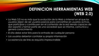 Este documento define las herramientas web 2.0 como sitios que permiten a los usuarios participar y contribuir al contenido en lugar de ser meros observadores pasivos. Explica que las herramientas web 2.0 incluyen wikis, blogs, redes sociales y plataformas de video que permiten a los usuarios crear y compartir contenido generado por ellos mismos. Finalmente, señala que el término fue acuñado en 1999 pero no se popularizó hasta 2004 gracias a los esfuerzos de Tim O'Reilly y otras personas.