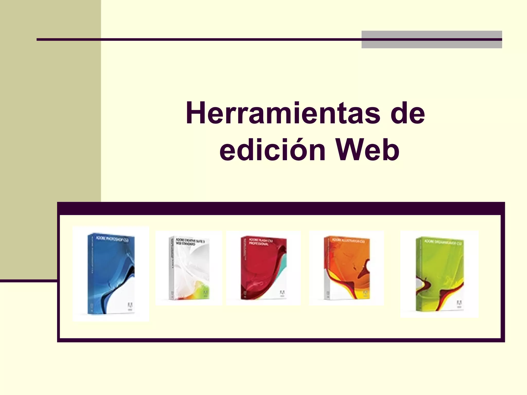 El documento describe varias herramientas de edición web como Dreamweaver, FrontPage y Composer, que permiten desarrollar portales web y gestionar bases de datos. También menciona programas de Adobe como Dreamweaver, Flash, Illustrator y Photoshop para crear e integrar contenido multimedia dinámico como video y sonido. Finalmente, destaca el paquete Adobe Web Premium para diseñar y mantener sitios y aplicaciones web interactivas.