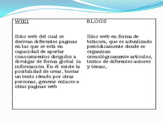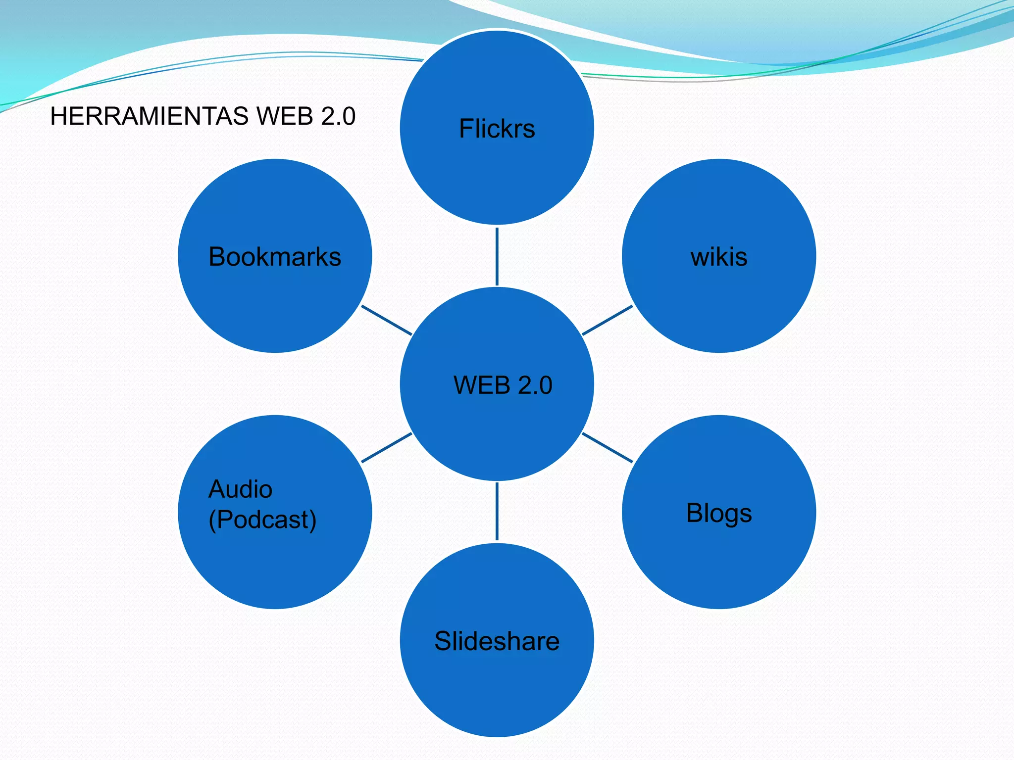 Este documento describe diferentes herramientas web 2.0 como wikis (Wikipedia, Wetpaint), blogs (Blogger, Wordpress), servicios para compartir presentaciones (Slideshare), audio (Podcast, Audacity, Odeo), bookmarks sociales, imágenes (Flickr, Picasa) y video (YouTube, Google Video). Explica brevemente el propósito y funcionalidad de cada una de estas herramientas.