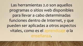 Las herramientas web 2.0 son programas y sitios web que permiten llevar a cabo funciones en Internet y aplicarlas al aprendizaje y la enseñanza. Se clasifican en redes sociales, wikis, blogs, sitios de videos, páginas de ventas, podcasts, presentaciones en línea y mapas mentales. Algunas herramientas populares son Prezi, Dropbox, YouTube, Twitter, Blogger y SlideShare.