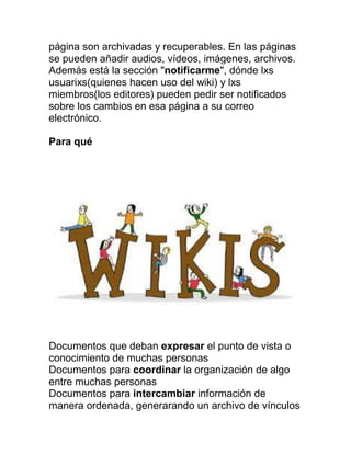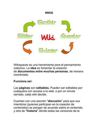 Wikispaces es una herramienta para la creación colaborativa de documentos entre múltiples personas. Las páginas de un wiki pueden ser editadas por cualquiera con acceso o por un grupo cerrado, y cuentan con secciones para discusión, historial de versiones, y notificación de cambios. Los wikis son útiles para documentos que expresen el punto de vista de muchos, coordinar organizaciones, e intercambiar información de manera ordenada.