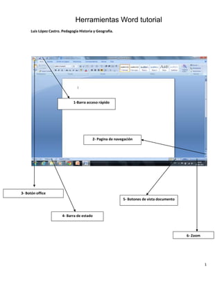 Este documento describe las principales herramientas de la interfaz de usuario de Microsoft Word. Estas incluyen la barra de acceso rápido para acceder fácilmente a funciones comunes, la página de navegación para moverse entre páginas, y botones para cambiar la vista del documento entre borrador, diseño de impresión y otros modos. También describe la barra de estado para ver información sobre la página, palabras y idioma actuales.