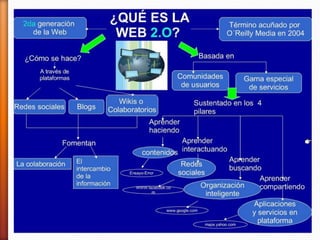 El documento analiza el impacto de Internet y la web 2.0 en diferentes ámbitos de la vida, destacando la transformación de las relaciones sociales y la producción de contenido por parte de los usuarios. También se discuten herramientas y servicios 2.0 que facilitan el trabajo en red y el aprendizaje colaborativo en entornos profesionales. Además, se menciona la evolución de Internet desde sus inicios hasta la actualidad, resaltando la importancia de la inteligencia colectiva y la creación de comunidades de práctica.