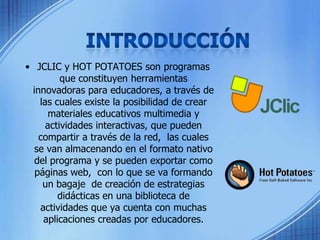 JClic y Hot Potatoes son herramientas de autor que permiten a los educadores crear materiales educativos multimedia e interactivos sin necesidad de conocimientos de programación. Estas herramientas incluyen aplicaciones como cuestionarios de respuesta múltiple, crucigramas, sopas de letras y más. El contenido creado se puede compartir en línea o exportar a páginas web, formando una biblioteca de actividades educativas.