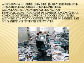 El documento detalla diversas herramientas de Google, como Google Webmaster, Google Buzz, Google Maps, Google Talk y Google Académico, describiendo sus funcionalidades y facilidad de uso. Se menciona cómo estas herramientas permiten a los usuarios gestionar blogs, compartir contenidos en redes sociales, crear mapas personalizados, y comunicarse efectivamente a través de mensajería y videoconferencia. Además, se resalta la utilidad de Google Académico para la búsqueda de literatura científica y la función de Picasa para la gestión y edición de fotos digitales.