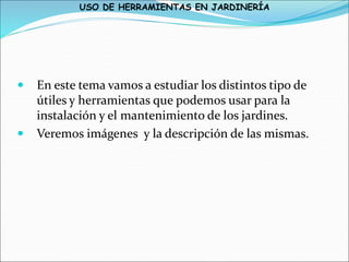 El documento describe las diferentes herramientas utilizadas en jardinería, incluyendo herramientas de corte como azadas y tijeras de podar, herramientas de limpieza como escobas y rastrillos, y otras herramientas como carretillas, palas y guantes. Explica las funciones y usos de cada herramienta para las tareas de instalación y mantenimiento de jardines.