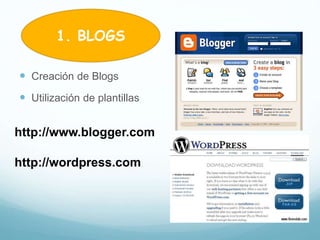 Este documento describe diversas herramientas web 2.0 que pueden aplicarse a la educación, incluyendo blogs, nubes, presentaciones y wikis online para compartir información; herramientas para crear encuestas, mapas conceptuales, comics y historietas animadas; y plataformas para gestionar cursos online y el conocimiento de manera colaborativa.