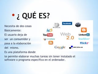 La Web 2.0 permite a los usuarios participar en la creación y edición de contenido en línea en lugar de solo consumirlo. Algunas herramientas de la Web 2.0 incluyen blogs para publicar contenido actualizado de forma cronológica, wikis para colaborar en lista de enlaces organizados, y redes sociales personales para conectarse con otros. La Web 2.0 facilita la creación de espacios colaborativos y participativos para que el aprendizaje sea virtual.