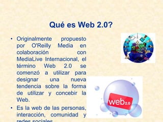 El documento describe las herramientas de la Web 2.0 y su aplicación a la educación. Explica que la Web 2.0 permite la interacción y participación de los usuarios a través de blogs, wikis y redes sociales. También contrasta la Web 1.0, de contenidos estáticos, con la Web 2.0, donde los usuarios comparten información de forma colaborativa. Finalmente, señala que las herramientas Web 2.0 pueden usarse para diseñar cursos virtuales que fomenten el aprendizaje colaborativo y centrado