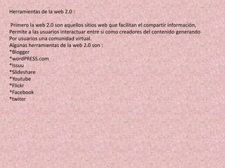 El documento describe las herramientas de la web 2.0, que permiten a los usuarios compartir información e interactuar entre sí como creadores de contenido generado por usuarios en comunidades virtuales. Algunas herramientas mencionadas son Blogger, WordPress, Issuu, Slideshare, YouTube, Flickr, Facebook y Twitter. El documento también discute las libertades que brindan estas herramientas, como la libertad de compartir, crear e integrar contenido y utilizar cualquier herramienta de la web 2.0.