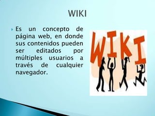Un wiki es un sitio web cuyos contenidos pueden ser editados por múltiples usuarios y permite el aprendizaje colaborativo. El primer wiki fue creado en 1995 y Wikipedia utiliza este formato. CmapTools es un software para crear mapas conceptuales de forma individual o colaborativa y permite enlazar archivos de manera interactiva.
