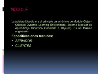 Moodle es un entorno de aprendizaje dinámico orientado a objetos que promueve una pedagogía constructivista social a través de herramientas como la colaboración y actividades. Es de fácil instalación y uso, requiriendo solo PHP y una base de datos, y ofrece seguridad en toda la plataforma. Proporciona ventajas como la posibilidad de que los alumnos participen en la creación de glosarios, pero también tiene desventajas como interfaces que podrían mejorarse y riesgos de seguridad dependiendo de la config