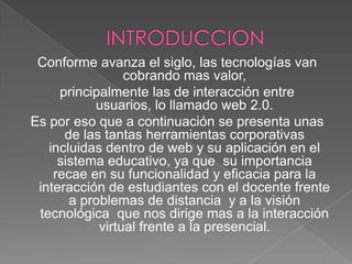 El documento describe diferentes herramientas de la Web 2.0 como foros, blogs, wikis y redes sociales y propone su uso en el sistema educativo. Explica brevemente qué son cada una de estas herramientas y cómo podrían aplicarse para mejorar la interacción entre estudiantes y docentes, superando problemas de distancia. Finalmente, incluye referencias bibliográficas sobre cada una de estas herramientas.