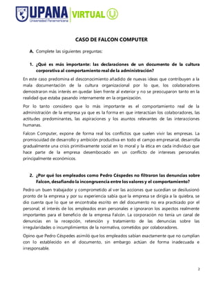 El documento analiza el caso de Falcon Computer y cómo la falta de alineamiento entre los valores declarados y el comportamiento real de la administración llevó a problemas. Los empleados no denunciaron las incongruencias por temor a represalias. Para evitar futuros problemas, los ejecutivos deben revisar que los empleados cumplan los valores a través de comunicación, liderazgo por ejemplo y auditorías. El aporte personal incluiría implementar un sistema de gestión de calidad y productividad, mejorar la motivación del personal y fortalecer la revis