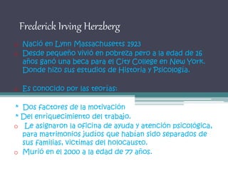Frederick Herzberg fue un psicólogo estadounidense conocido por sus teorías sobre la motivación en el trabajo. Propuso que existen dos tipos de factores que afectan la satisfacción de los empleados: factores higiénicos como el salario y las condiciones de trabajo, los cuales previenen la insatisfacción, y factores motivacionales como el reconocimiento y las responsabilidades, los cuales generan satisfacción. También sugirió que para motivar a los empleados es necesario enriquecer sus puestos de trabajo con t