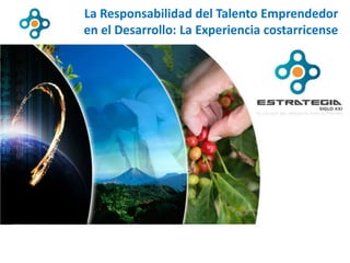 El documento describe la estrategia de Costa Rica para lograr el desarrollo a través de la ciencia, la tecnología, la educación y la innovación. Costa Rica ha disfrutado de estabilidad política y democracia durante más de 120 años. La estrategia se desarrolló a través de un proceso participativo que involucró a más de 200 líderes. La visión es convertir a Costa Rica en un país desarrollado mediante el conocimiento para 2050.