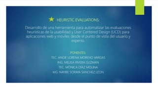 Este documento presenta el desarrollo de una aplicación móvil llamada "HEURISTIC EVALUATIONS" que permite automatizar evaluaciones heurísticas de usabilidad y calidad de software desde la perspectiva del usuario y experto. El proyecto utiliza metodologías como RUP para el desarrollo del software y realiza pruebas para validar la funcionalidad, seguridad y rendimiento de la aplicación. El objetivo es contar con una herramienta que facilite evaluaciones sistematizadas de usabilidad para aplicaciones web y móviles