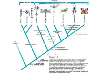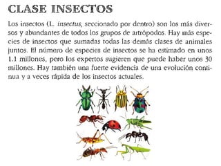 Este documento describe las cuatro clases de hexápodos: Diplura, Protura, Collembola e Insectos. Se detalla que los insectos tienen órdenes como los zapateros de mar, y características como antenas, músculos de vuelo y hábitos alimenticios. También cubre estructuras como espiráculos, tráqueas y órganos timpánicos, así como métodos de reproducción, protección y control de insectos.