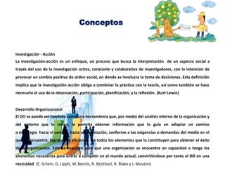 El documento define conceptos clave relacionados con la organización y la gerencia de organizaciones. Explica que una organización es un sistema diseñado para alcanzar objetivos mediante subsistemas relacionados. También define conceptos como análisis organizacional, investigación-acción, desarrollo organizacional, cultura organizacional, aprendizaje organizacional y más.