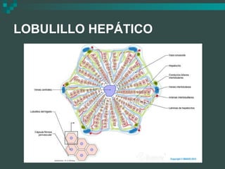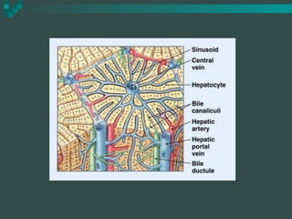 El documento describe las principales funciones y procesos metabólicos del hígado, incluyendo la metabolización de grasas, hidratos de carbono, proteínas y otras sustancias; la producción de bilis; y la desintoxicación de drogas y toxinas. El hígado desempeña un papel clave en el metabolismo a través de procesos como la gluconeogénesis, lipogénesis, desaminación de aminoácidos, y oxidación-reducción.