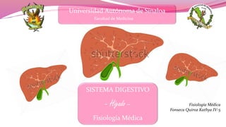 El documento describe la estructura y funciones del hígado. El hígado está compuesto de placas hepáticas separadas por sinusoides que permiten el paso de proteínas. El hígado desempeña funciones vitales como eliminar sustancias nocivas de la sangre, metabolizar lípidos, carbohidratos y proteínas, desintoxicar la sangre, secretar bilis y sintetizar proteínas y sales biliares.