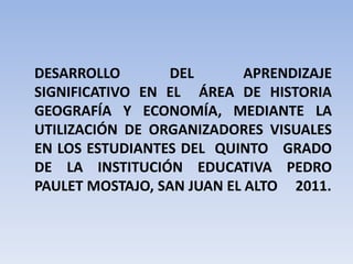 Este documento presenta los resultados de un plan de acción para desarrollar aprendizajes significativos en el área de Historia, Geografía y Economía mediante la utilización de organizadores visuales en estudiantes de quinto grado. Los resultados mostraron que el uso de estrategias participativas y de procesamiento de información mejoraron la participación y transferencia de conocimientos de los estudiantes. Adicionalmente, la incorporación de organizadores visuales en la planificación curricular hizo que las actividades fueran más atractivas para los estudiantes.