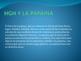 La papaína es una enzima extraída de la papaya, conocida por sus propiedades antiinflamatorias y digestivas, y se utiliza en diversas industrias, incluyendo la alimentaria y cosmética. Además, la papaya es rica en vitaminas y antioxidantes, siendo eficaz en el tratamiento de trastornos digestivos y en la cicatrización de la piel. Sin embargo, se debe tener precaución al consumirla debido a posibles alergias a la papaína.