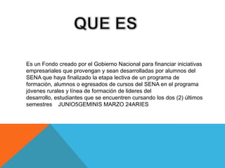 El Fondo Emprender es un fondo creado por el gobierno de Colombia para financiar iniciativas empresariales de estudiantes y egresados del SENA. El objetivo es apoyar proyectos productivos que apliquen los conocimientos adquiridos en la formación. El fondo provee capital semilla facilitando el acceso a los recursos necesarios para lanzar nuevas unidades de negocio. El proceso incluye la formulación de un plan de negocios, su evaluación y asignación de recursos, y la ejecución con seguimiento y evaluación de