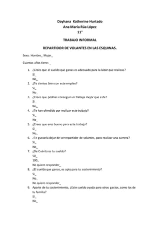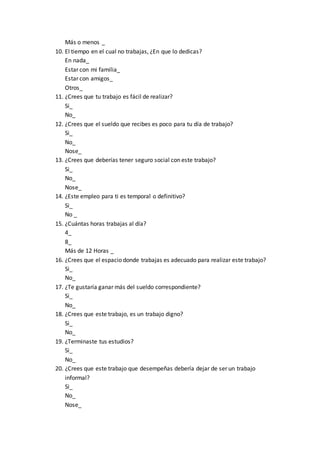 Este documento presenta una encuesta de 20 preguntas dirigida a repartidores de volantes sobre su trabajo informal. Las preguntas cubren temas como el sueldo, las condiciones laborales, la seguridad social, las horas de trabajo y si consideran su trabajo digno o temporal. La encuesta busca conocer la perspectiva de los repartidores sobre su empleo actual.