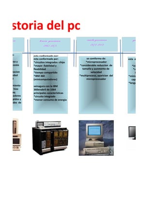 El documento resume las principales generaciones de computadoras desde los primeros tiempos hasta la actualidad. La primera generación utilizaba tubos de vacío y tarjetas perforadas. La segunda introdujo los transistores y lenguajes como FORTRAN. La tercera presentó los circuitos integrados. La cuarta trajo los microprocesadores. La quinta ha evolucionado con inteligencia artificial, sistemas expertos y mayor capacidad de memoria.