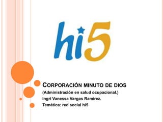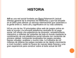 hi5 es una red social fundada en 2003 que ofrece juegos y contenido social a millones de usuarios a nivel mundial. Los usuarios pueden compartir fotos, comentarios, y agregar amigos en su perfil. hi5 tiene características como comentarios, amigos ilimitados, diarios, y aplicaciones. Algunas ventajas son socializar y darse a conocer, mientras que las desventajas incluyen perfiles falsos, invitaciones no deseadas, y fallas técnicas.