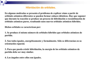 1) La hibridación implica la recombinación de orbitales atómicos puros para formar nuevos orbitales híbridos.