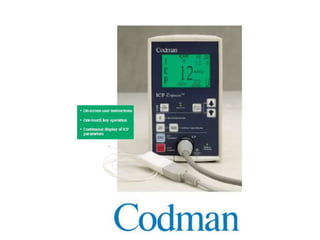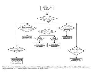 Este documento resume la hipertensión intracraneal en niños con trauma craneoencefálico. Explica que la hipertensión intracraneal es la principal causa de muerte en estos pacientes y describe los síntomas clínicos. También cubre la fisiopatología, el monitoreo, y el manejo médico para mantener una presión intracraneal baja y una adecuada presión de perfusión cerebral.
