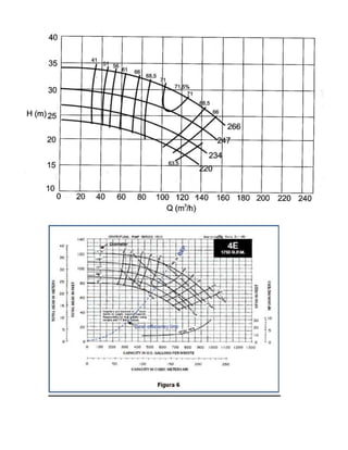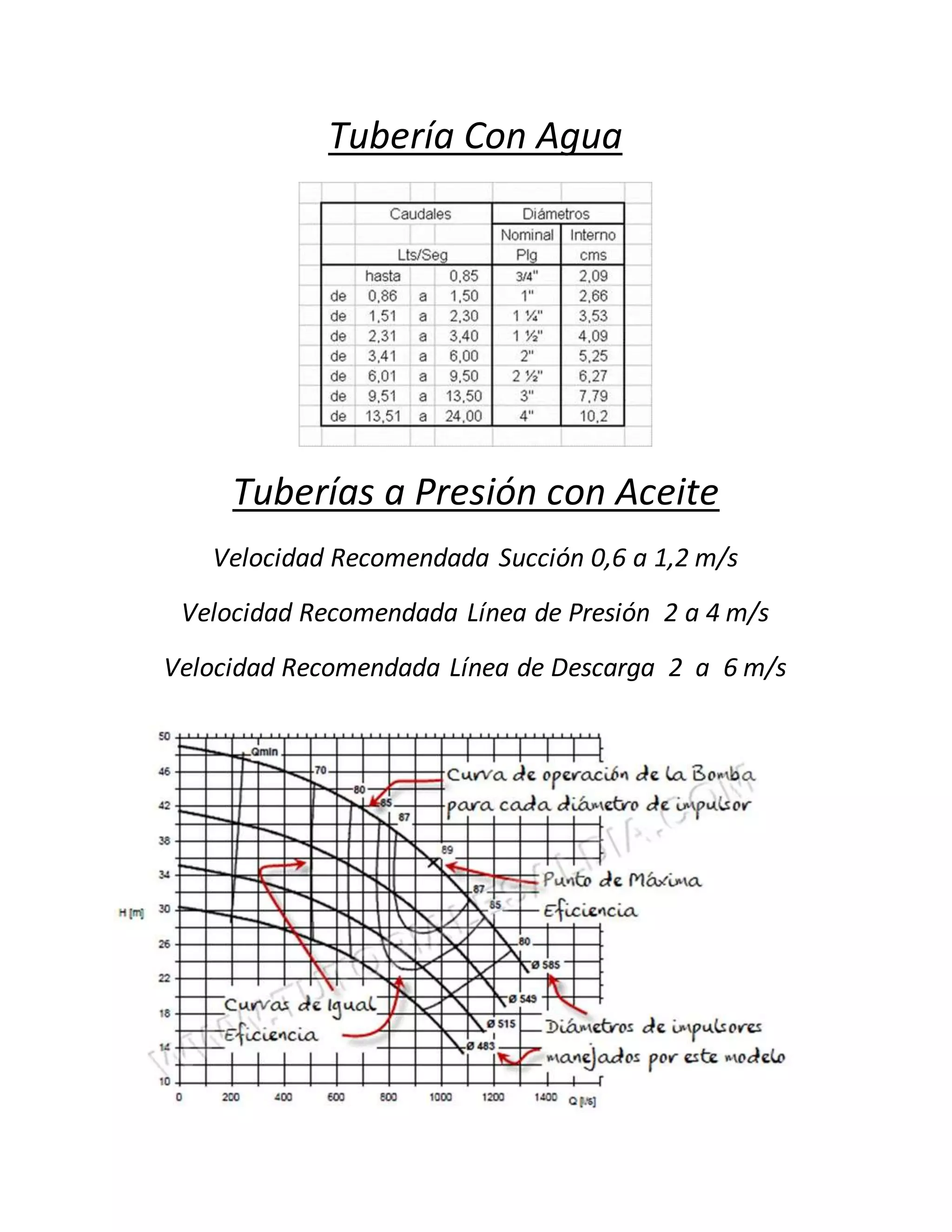 El documento presenta información sobre velocidades recomendadas para tuberías de agua y aceite, y proporciona ejemplos de cálculos de viscosidad de aceites, potencia de bombas, presión y caudal en sistemas hidráulicos. Incluye tablas y figuras con especificaciones para realizar cálculos sobre estos temas.