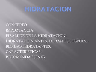 La hidratación es fundamental para la salud y el rendimiento deportivo. Se recomienda beber al menos 2,5 litros de líquido al día, e incluso más si se realiza ejercicio o hace calor. Es importante beber antes de tener sed para prevenir la deshidratación. La pirámide de la hidratación clasifica las bebidas según su contenido en nutrientes y sales, siendo las aguas minerales la base recomendada.