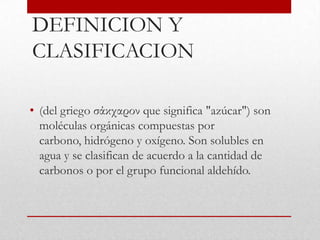 Este documento proporciona una definición de los hidratos de carbono y clasifica los principales tipos: monosacáridos, disacáridos, oligosacáridos y polisacáridos. Explica que los hidratos de carbono cumplen funciones energéticas y estructurales en el cuerpo. Describe el proceso de digestión e absorción de los hidratos de carbono y algunas enfermedades relacionadas como la diabetes. Finalmente, distingue entre edulcorantes calóricos y acalóricos.