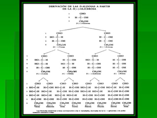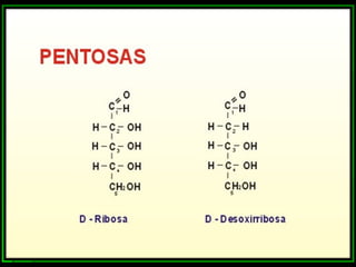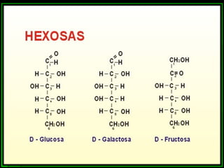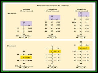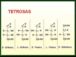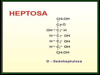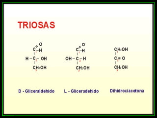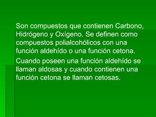 Los monosacáridos son compuestos orgánicos que contienen carbono, hidrógeno y oxígeno. Se clasifican según el número de átomos de carbono que contienen, como triosas (3 carbonos), tetrosas (4 carbonos), pentosas (5 carbonos) y hexosas (6 carbonos). Pueden presentar diferentes tipos de isomería como la funcional, óptica y conformacional. Algunos monosacáridos importantes son la glucosa, la fructosa, la ribosa y la desoxirribosa.