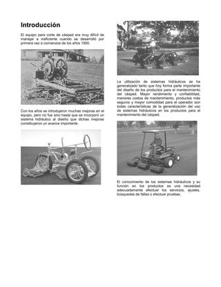 Este documento describe la evolución de los sistemas hidráulicos en los equipos para el mantenimiento del césped. Inicialmente, este equipo era difícil de manejar e ineficiente, pero la incorporación de sistemas hidráulicos mejoró significativamente el rendimiento, la confiabilidad y la comodidad del operador. El documento luego explica los principios básicos de los sistemas hidráulicos y los componentes comunes como bombas, válvulas y cilindros, y cómo funcionan juntos para transmitir presión y flujo de