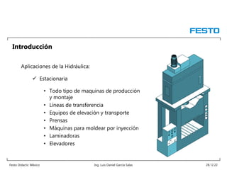 El documento trata sobre la hidráulica. Explica que la hidráulica utiliza fluidos sometidos a presión para transmitir fuerzas y movimientos. Describe algunas aplicaciones comunes de la hidráulica como maquinaria industrial, de construcción y agrícola. También cubre conceptos básicos como la transmisión de fuerzas y desplazamientos a través de la hidráulica.